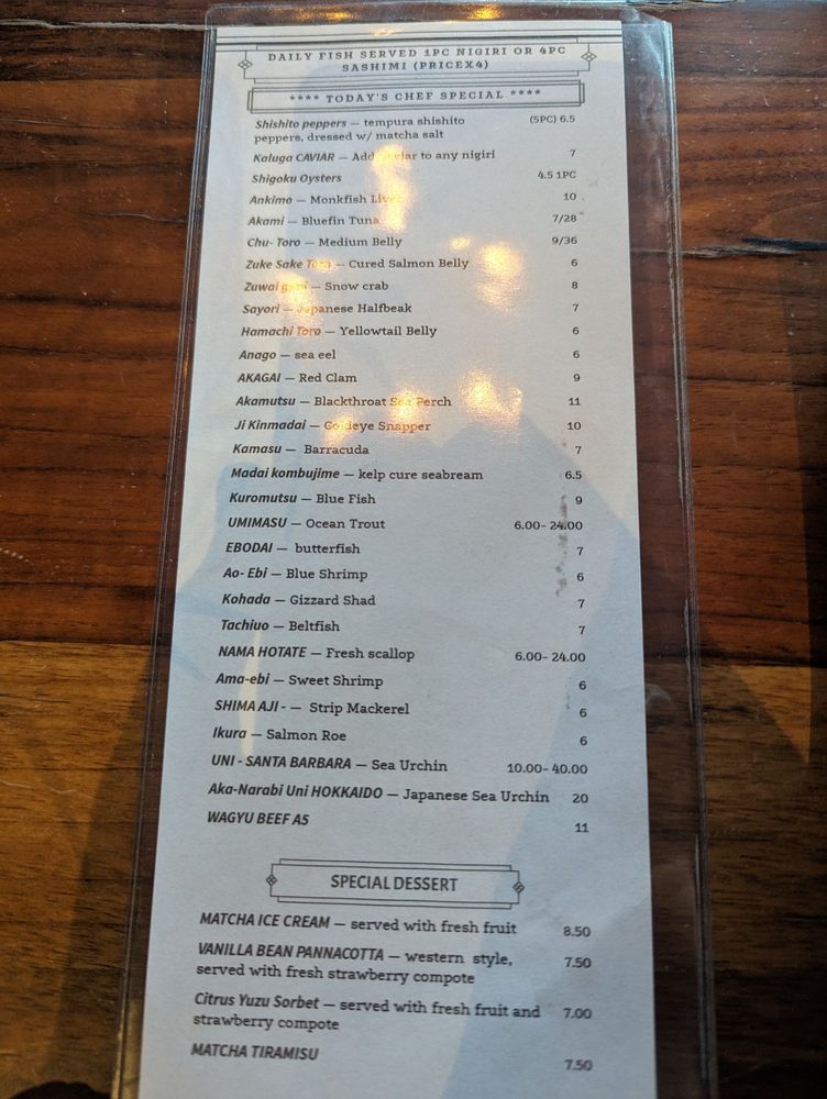 ZUKE SAKE TORO - SHIMA AJI HAMACHI- AKAMI- AO- EBI- UNI- SUZUKI- UNAGUI- TORO- HOTATE - UMIMASU- (fish selection may vary)